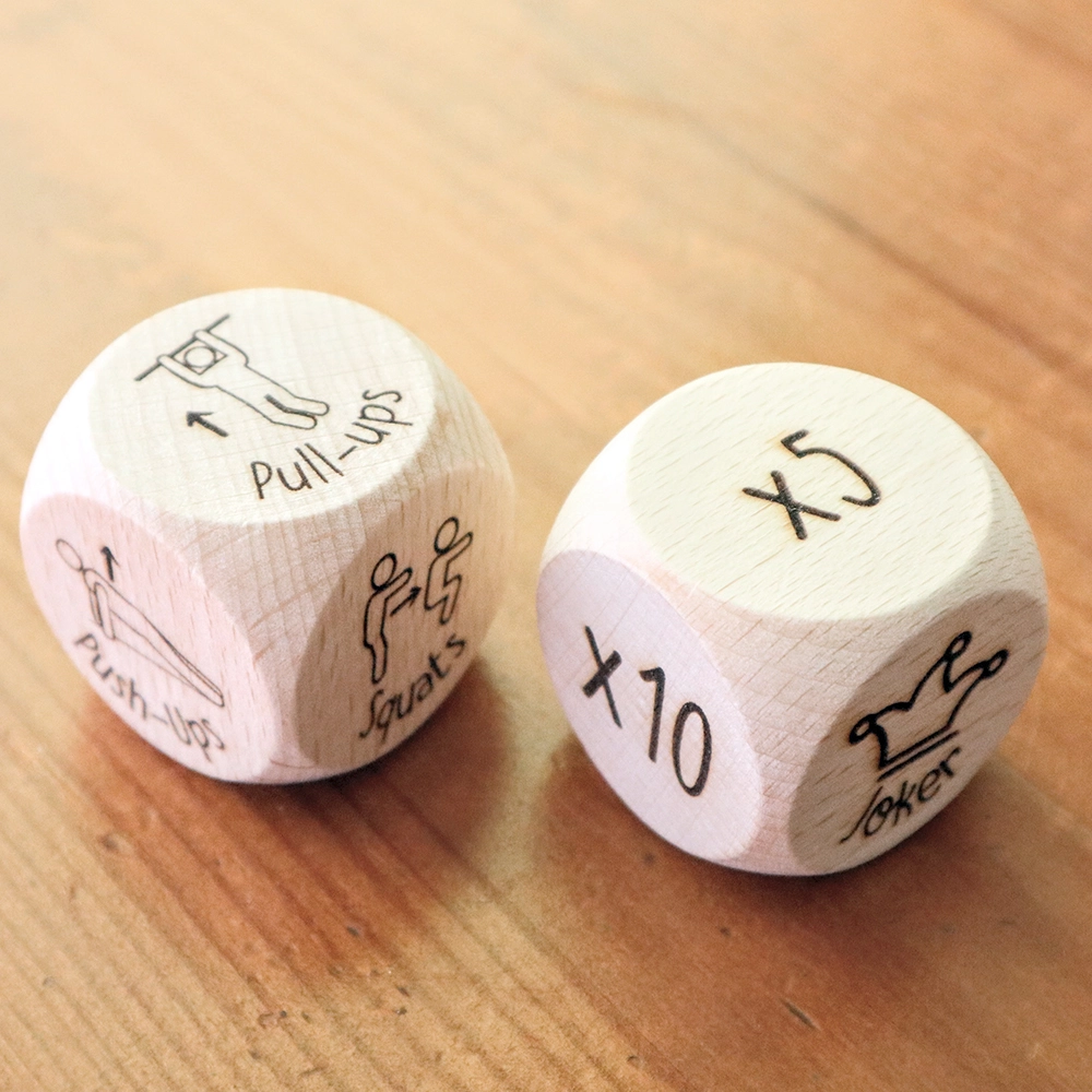 Due dadi, uno per l’esercizio, uno per il numero di ripetizioni, da personalizzare ovviamente con i vostri esercizi preferiti. Le regole sono semplici: lanciare i due dadi, eseguire il movimento, poi ripetere il più possibile!